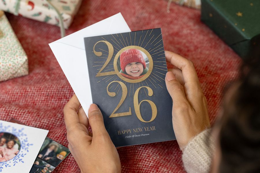 Our top Christmas card cover idea: Got some big news to share next year? Use this New Year card to share big news like a wedding, a new baby, or exciting plans for 2026, giving your holiday greeting a personal twist.